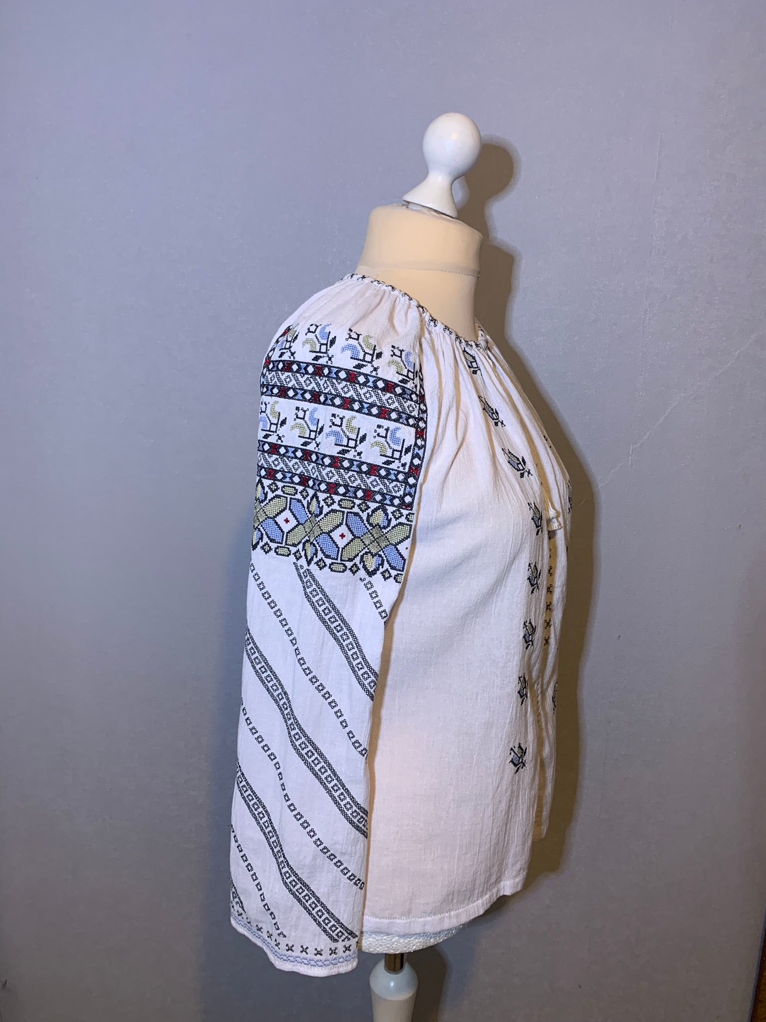 The blouse is made of a natural cotton fabric and decorated with machine embroidery. Although the ornaments are made by machine, there is a lot of manual work to finish the blouse.